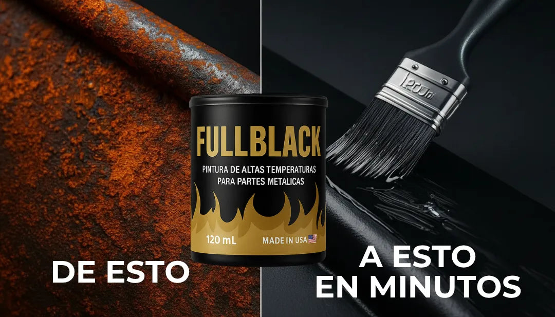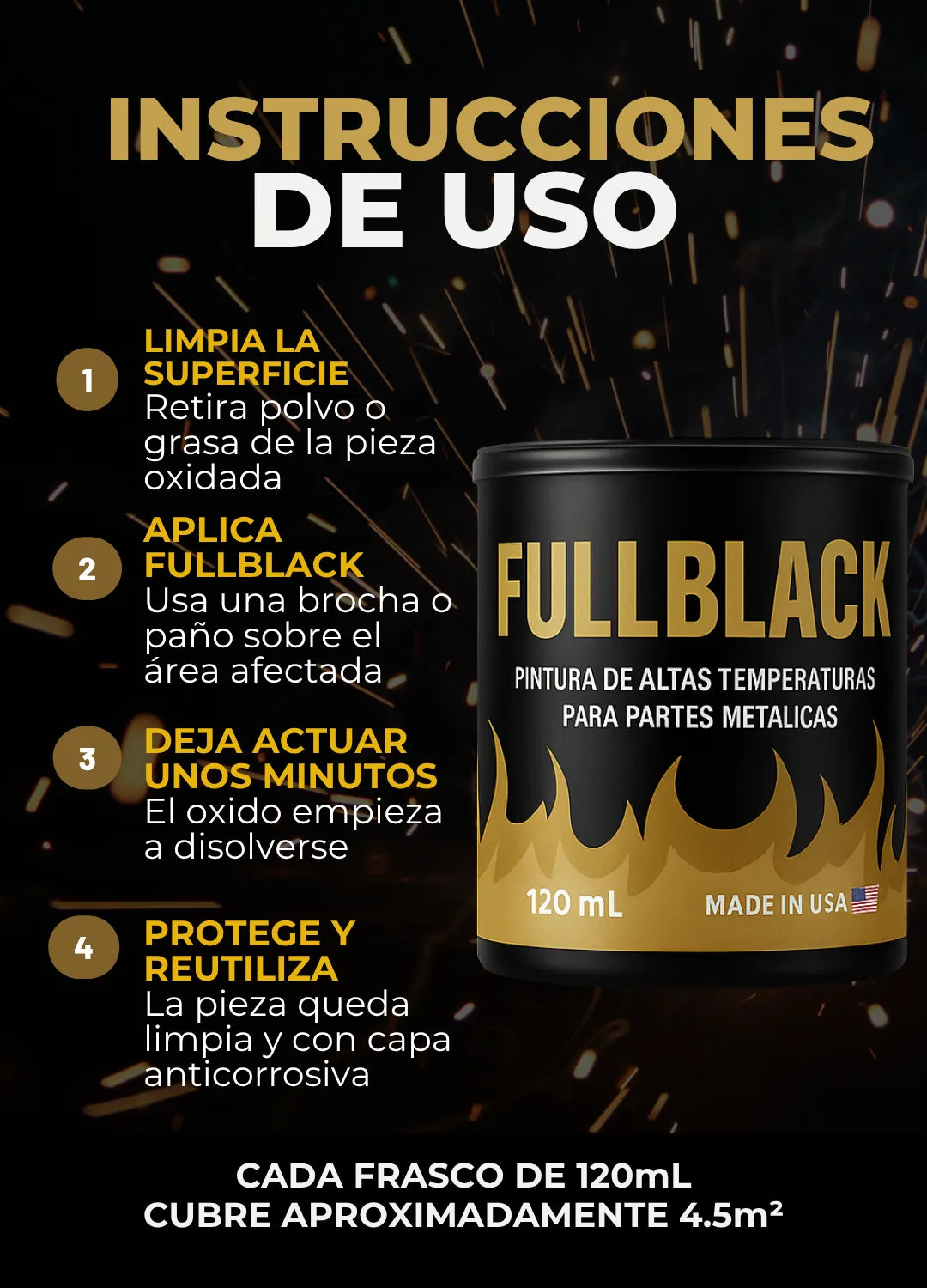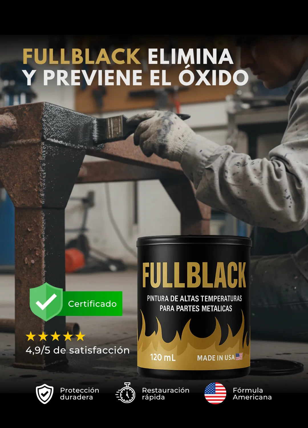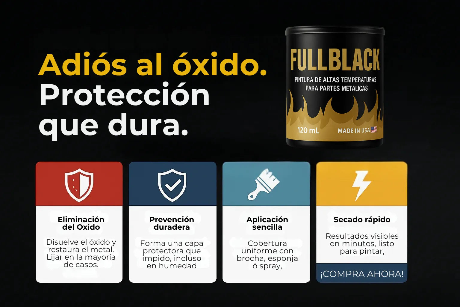 Con tecnología americana de encapsulado, FullBlack elimina el óxido al contacto y evita que vuelva a aparecer, sin necesidad de lijar ni desmontar. Su fórmula negra crea una capa protectora resistente que sella y renueva la superficie del metal. Ideal para estructuras metálicas, herramientas y mucho más.
